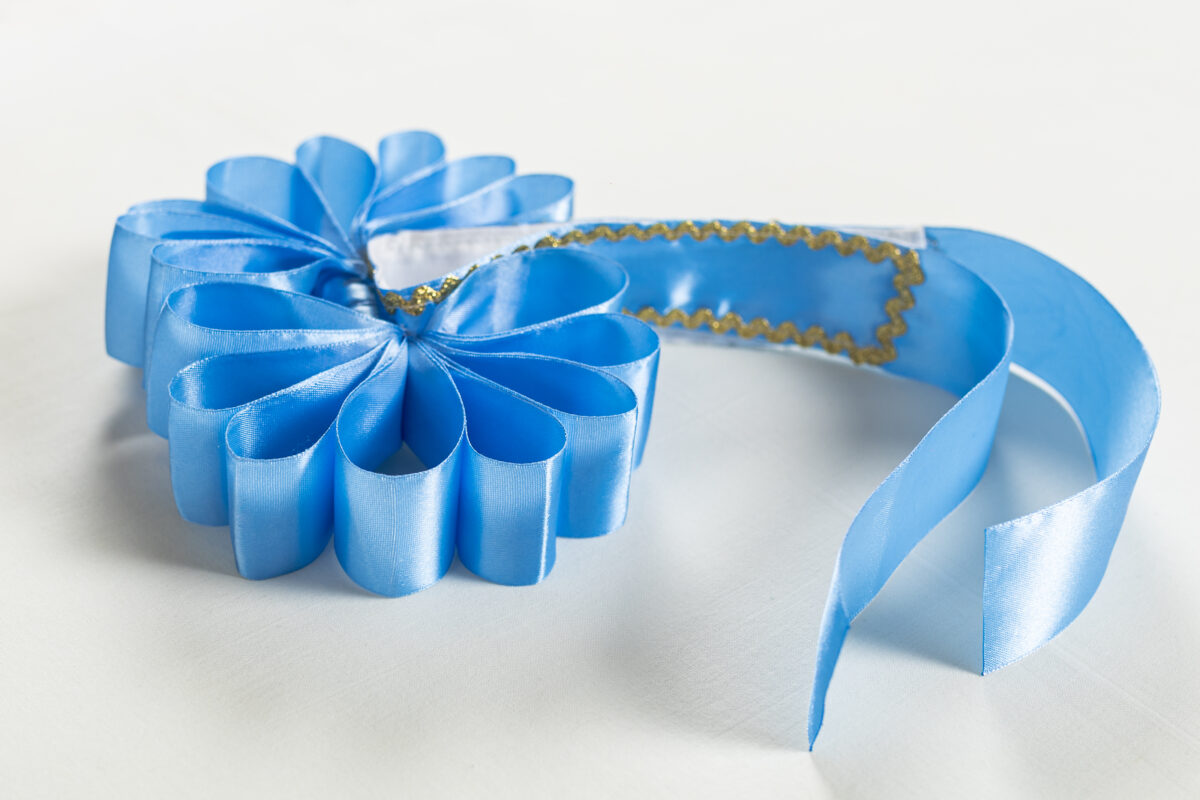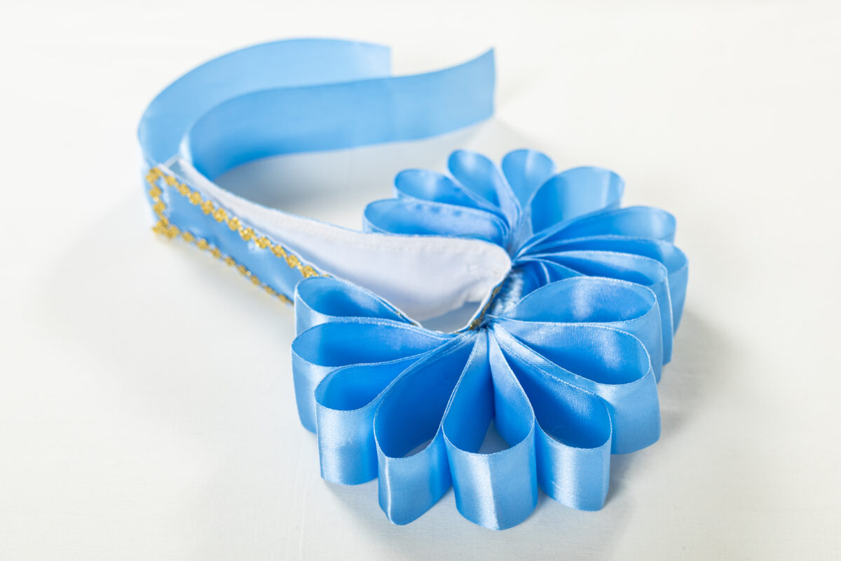 A pántlika 4 és 5 cm szelességű szatén szalagból készül. Alapján különböző mintájú, arany szegélyezésű paszomány díszíti. Szára elég hosszú, így különböző fejméretű lányok is egyaránt tudják viselni.