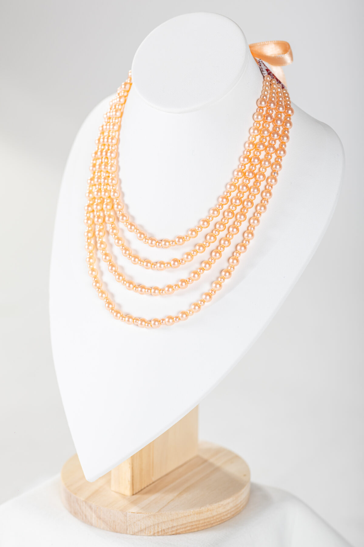 A gyöngysorok négy szálból állnak, azon váltakozva 4 és 6 mm-es műanyag festett gyöngyökkel. Hátulja 1 cm-es szatén szalaggal tudod tetszőleges hosszúságban rögzíteni.