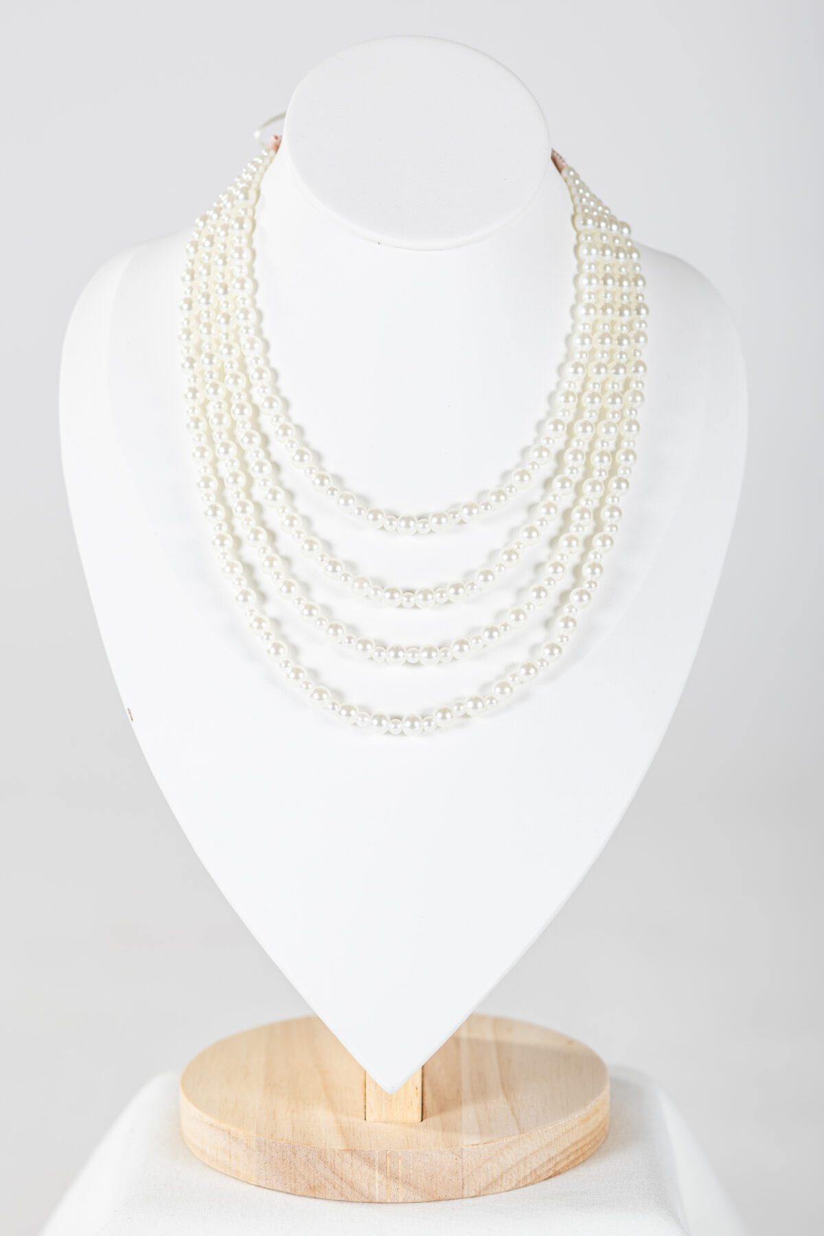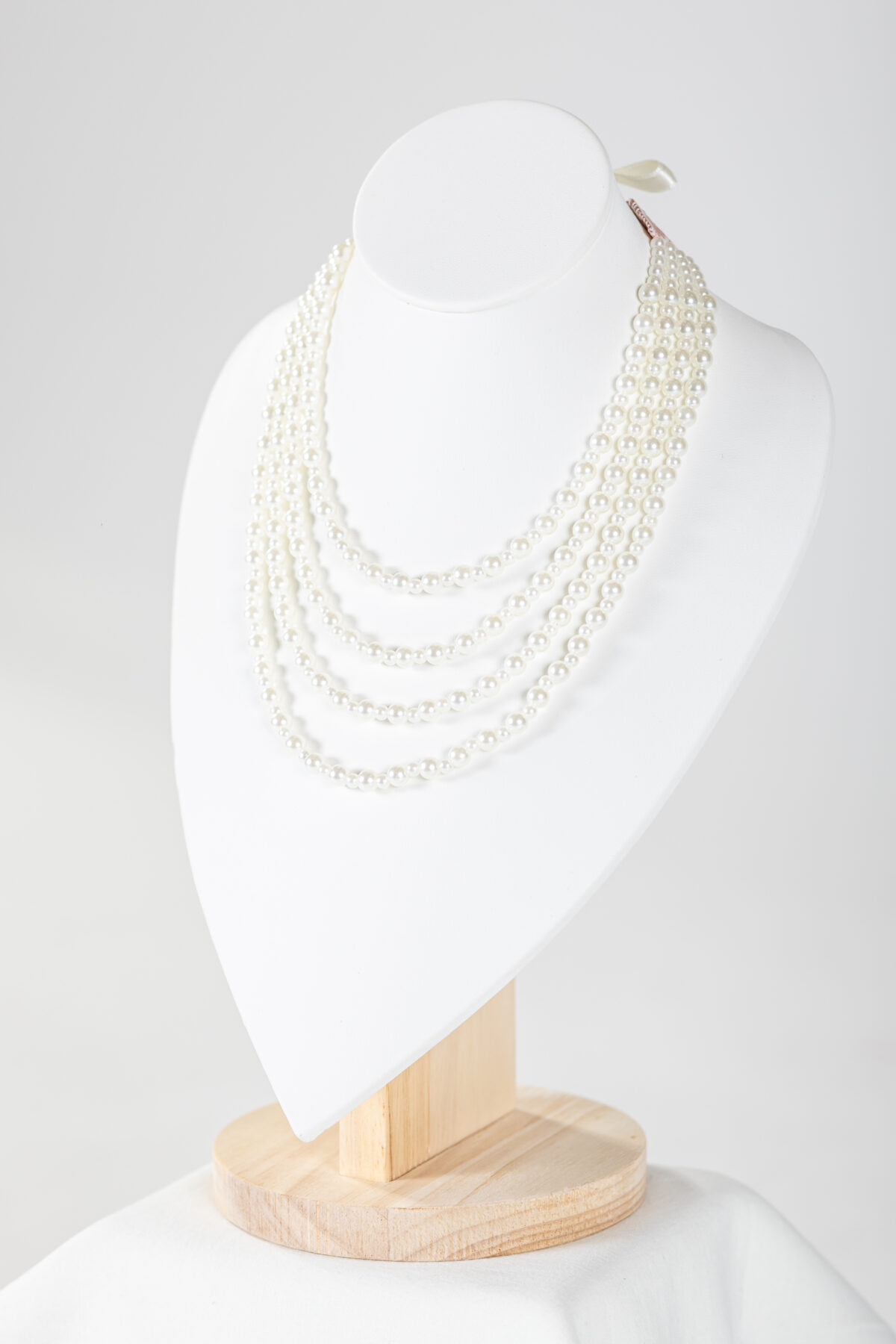 A gyöngysorok négy szálból állnak, azon váltakozva 4 és 6 mm-es műanyag festett gyöngyökkel. Hátulja 1 cm-es szatén szalaggal tudod tetszőleges hosszúságban rögzíteni.