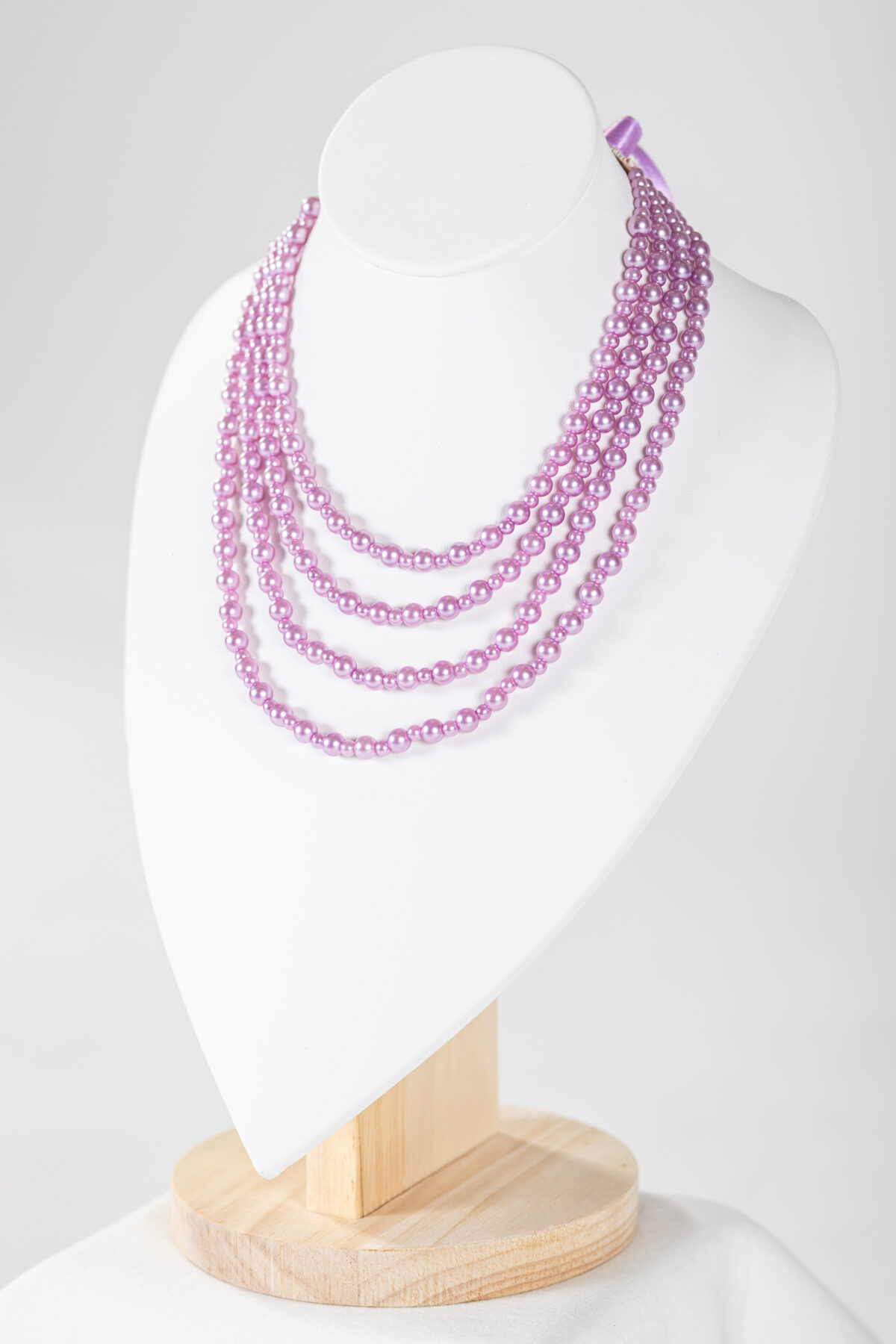 A gyöngysorok négy szálból állnak, azon váltakozva 4 és 6 mm-es műanyag festett gyöngyökkel. Hátulja 1 cm-es szatén szalaggal tudod tetszőleges hosszúságban rögzíteni.