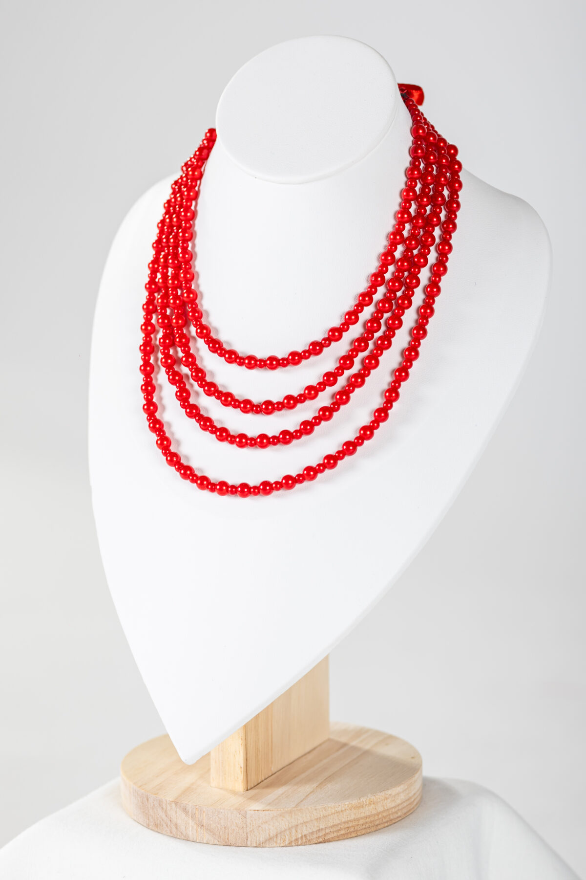 A gyöngysorok négy szálból állnak, azon váltakozva 4 és 6 mm-es műanyag festett gyöngyökkel. Hátulja 1 cm-es szatén szalaggal tudod tetszőleges hosszúságban rögzíteni.