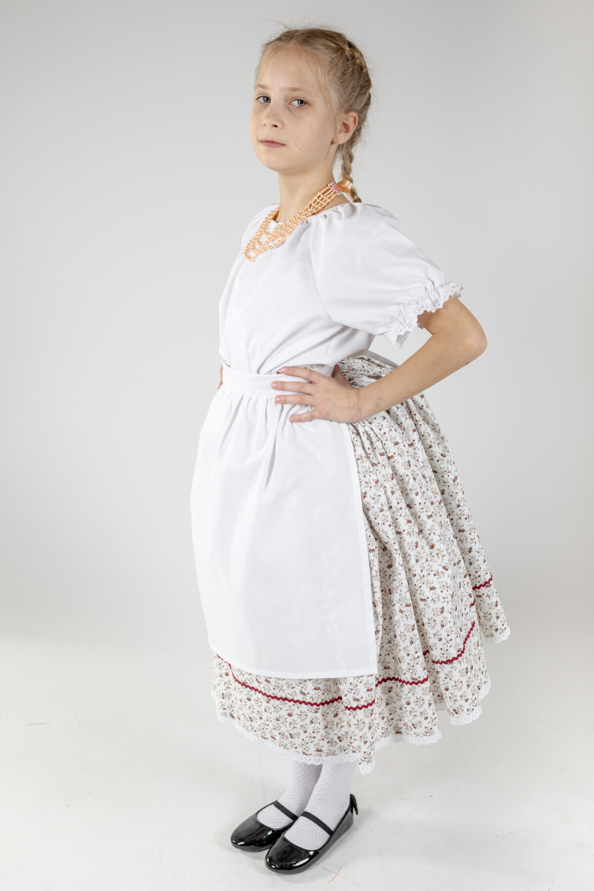 Hagyományőrző fehér matyó néptáncos szoknya gyerekeknek, amely tökéletes néptánc próbákhoz és fellépésekhez. Kényelmes, rugalmas derekú, 100%-os pamutvászonból készült.